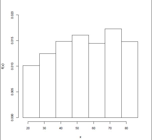 Auf der y-Achse sollte die Dichte stehen. Also als Bsp. für die erste Klasse (17,27] müsste der Balken dort bis 0,00955 gehen (da 0,0955:10= 0,00955, weil 0,0955 die relative Häufigkeit (cumsum-Befehl) von dieser Klasse ist und 27-17 = 10)