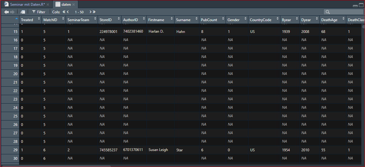 Wir sollen immer den jeweiligen Wissenschaftler mit den darunterliegenden Alternativen (also mit den selben MatchID´s) vergleichen.