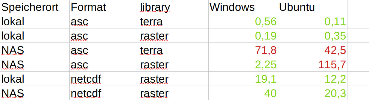 Liegen die Daten lokal, dauert das Lesen der 24 Raster 0,35 Sekunden. Liegen sie auf dem Netzlaufwerk, mehr als 300 mal so lange. Ich habe verschiedene Systeme (Ubuntu und Windows, lokal und NAS, .ascii-Dateien und netcdf-Dateien) getestet. Einmal mit der terra und einmal mit der raster-Bibliothek. Die Lesedauern in Sekunden sind in der folgenden Tabelle zu sehen. Rote Werte sind die langsamen Lesezeiten, grün sind Werte die im erwarteten Bereich liegen.
