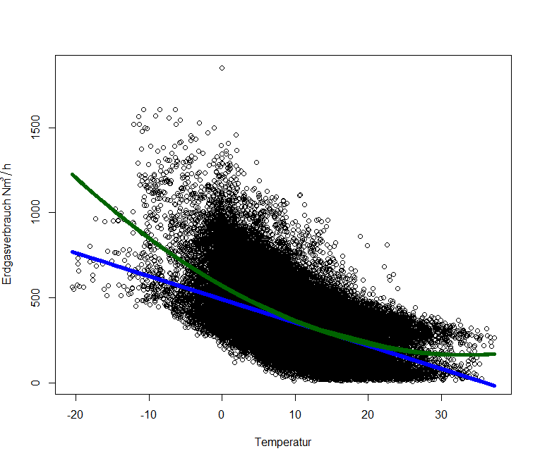 folgende Frage: Ist es möglich ein Modell aufzustellen, welches aus einem nichtlinearer Term und einem linearen Term besteht? Und zwar habe ich abseits meiner Masterarbeit überlegt, ob man die Variable Außentemperatur nicht exponentiell darstellen kann mit einem Polynom zweiten oder auch dritten Grades, siehe beigefügtes Diagramm. Meines Erachtens lässt sich dieser Zusammenhang noch besser durch eine nichtlineare Funktion (grüne
