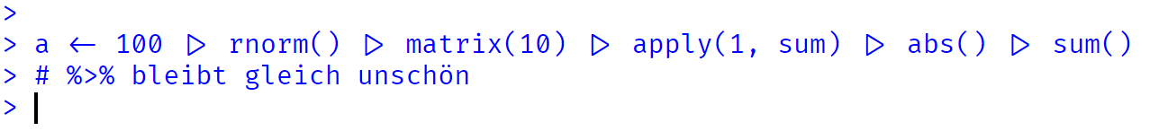 mit R Version 4.1 ist die native Pipe als denkbare Konkurrenz zur magrittr Pipe eingeführt worden und ich frage mich, welchen Sinn die zweite Pipe hat und ob sie sich durchsetzen wird. Klar ist, sie funktioniert anders: "The simple form of the forward pipe inserts the left-hand side as the first argument in the right-hand side call."