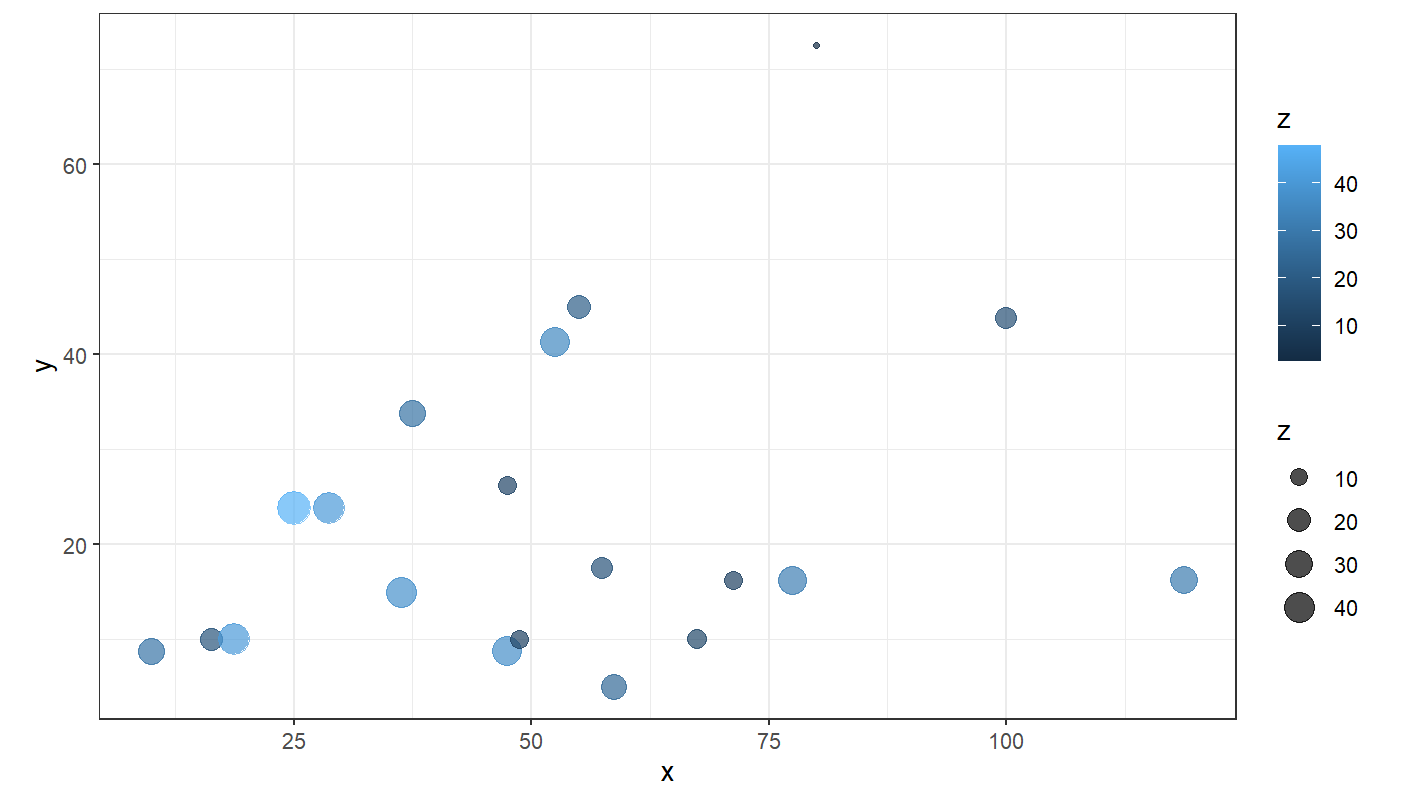 ggplot(b, aes(x = x, y = y, col = z, size = z)) +