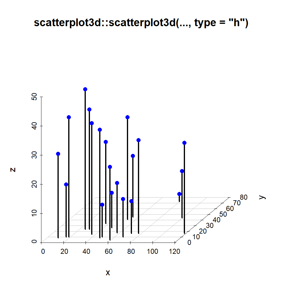 main = "scatterplot3d::scatterplot3d(..., type = \"h\")")