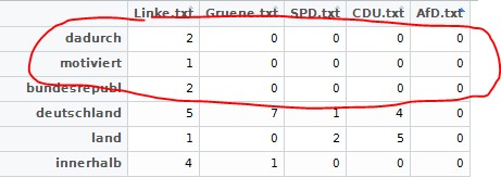 Nun möchte ich aber vor meiner Analyse alle Wörter bzw. Variablen entfernen, die von nur einer Partei verwendet werden. Es ist dabei egal ob sie von dieser einen Partei 15-mal benutzt werden. Ist diese Partei die einzige, muss die Variable gelöscht werden.