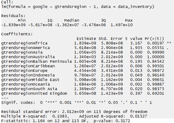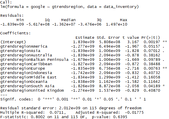 Und zwar geht es darum, dass ich eine lineare Regression durchgeführt habe. Im folgenden seht ihr die Ergebnisse der 1. linearen Regression für die unabhnägige Variable "gtrendsregion". Die Variable hat die Ausprägungen "America", "Asia", "Australia" etc.