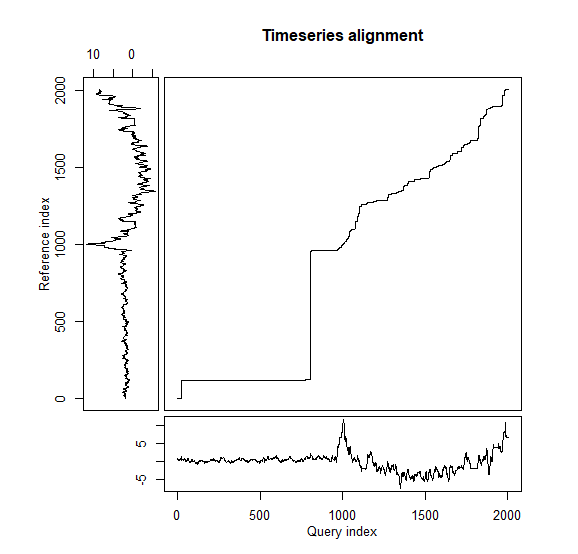 Als Ergebnis des Versuchs in R (anhand der Anleitung von http://dtw.r-forge.r-project.org/) erhalte ich diese beiden plots: