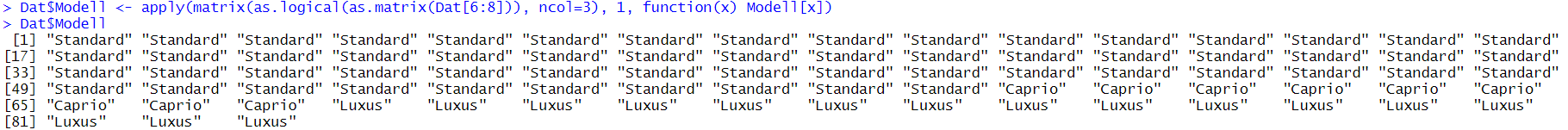 apply(matrix(as.logical(as.matrix(Dat[6:8])), ncol=3), 1, function(x) Modell[x])