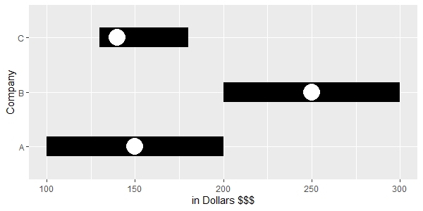 Am besten wäre ein senkrechter Strich am Anfang und Ende des Balkens sowie die dazugehörigen Werte an den beiden Strichen. Sollten einmal mehr Unternehmen dazukommen, würde eine Verlängerung auf den Wert an der Achse wohl zu unübersichtlich.