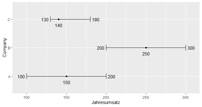 ich möchte das Maximum, das Minimum und den Durchschnitt eines bestimmten Merkmals als horizontales Balkendiagramm darstellen. Ich habe z.B. den Jahresumsatz von zwei Unternehmen für zehn Jahre vorliegen und möchte ein horizontales Balkendiagramm erstellen, wobei der jeweilige Balken eines Unternehmens vom kleinsten Umsatz innerhalb der 10 Jahresperiode (Minimum) bis zum höchsten Umsatz innerhalb der Periode (Maximum) dargestellt werden soll und der Durchschnitt durch eine vertikale Linie durch den Balken markiert wird. Die Werte von Min, Max und Durchschnitt sind bereits in R eingelesen und müssen nicht mehr berechnet werden. Die Datenstruktur sieht wie folgt aus: