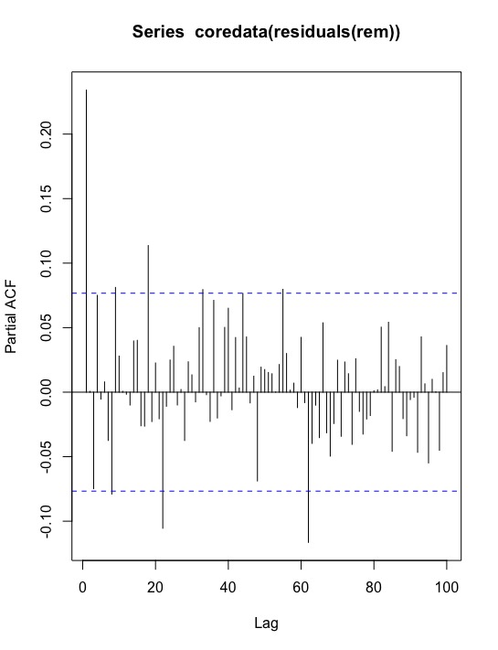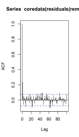 acf(coredata(residuals(rem)),ci = 0.95, lag.max = 100)Vielleicht kann mich einer erleuchten.