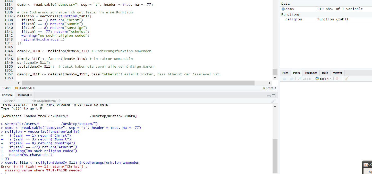 Was Du geschrieben hast kannst Du Dir aus Deinem Bildschirmfoto selbst raussuchen. Jedenfalls erzeugst Du da völlig unnötige NA und ja, diese NA lassen meinen Code von oben abstürzen. Kann man reparieren, war hier aber nützlich, weil es gezeigt har, dass Du beim Einlesen die Atheisten schon alle zu NA gemacht hast..