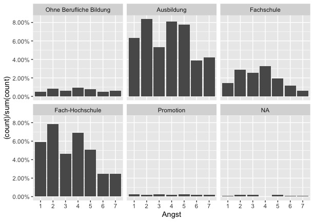 Allerdings ist das Ergebnis noch nicht so ganz so, wie ich es gerne hätte. Gibt es die Möglichkeit die Werte in Relation zueinander zu setzen? Die Angaben in den einzelnen Tabellen zeigen das Verhältnis zu der Gesamtanzahl der Antworten. Mein Ziel ist es, die jeweiligen Antworten in Relation zu den jeweiligen Bildungsabschlüssen zu stellen, sodass die einzelnen Tabellen miteinander vergleichbar werden. Also dementsprechend, dass beispielsweise 10% der Personen ohne Bildungsabschluss eine Ausprägung der Angst von 2 haben und 10% all derer, die eine Ausbildung haben. Somit wären die Balken gleich groß, obwohl in absoluten Zahlen bei keinem Bildungsabschluss nur beispielsweise fünf Personen so geantwortet habe, bei denen mit Ausbildung allerdings 40.