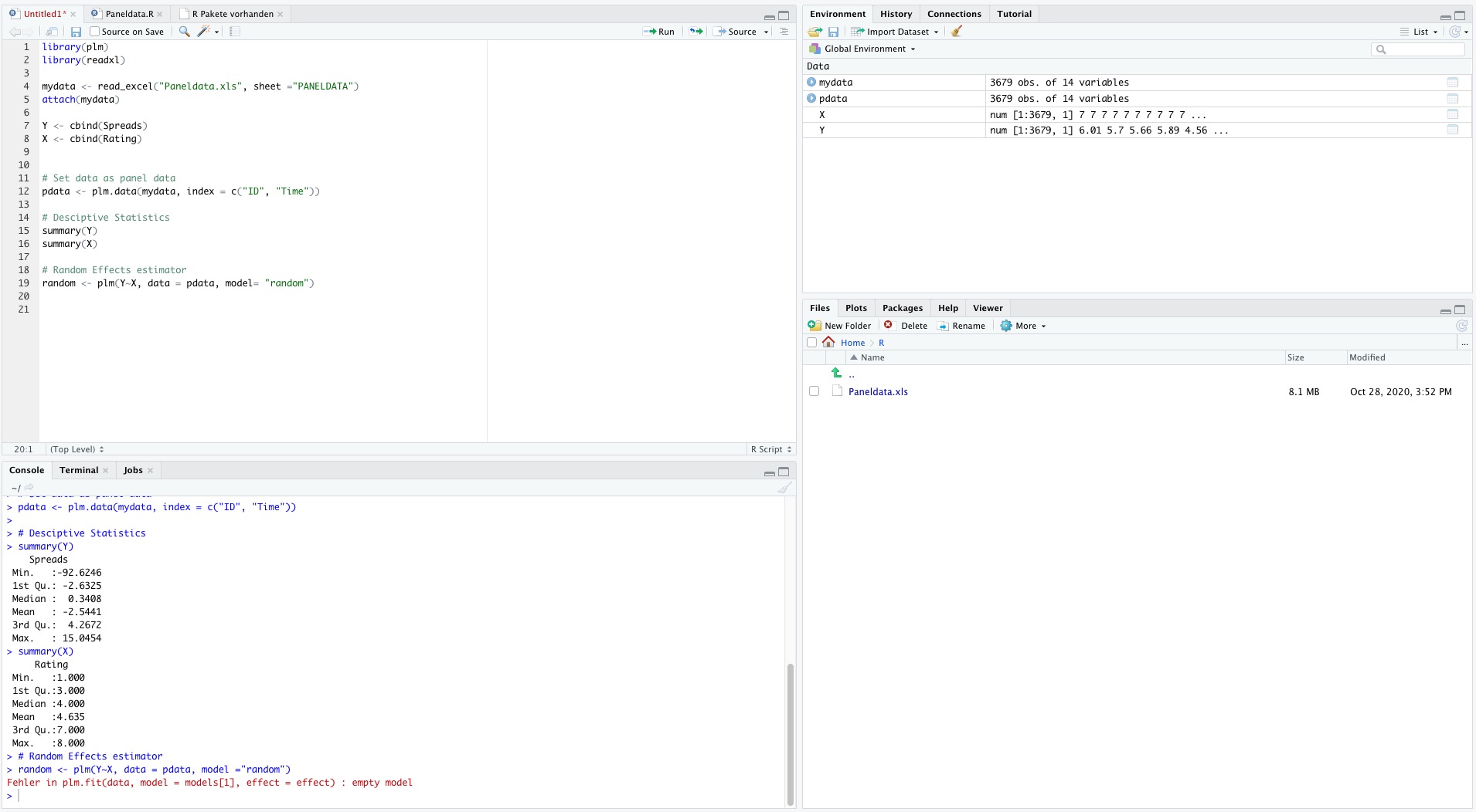 library(plm) mydata <- read.csv2("http://forum.r-statistik.de/download/file.php?id=1184", dec=".") pdata <- plm.data(mydata, index=c("ID", "Time")) r <- plm(Spreads ~ Rating, data=pdata, model="random")