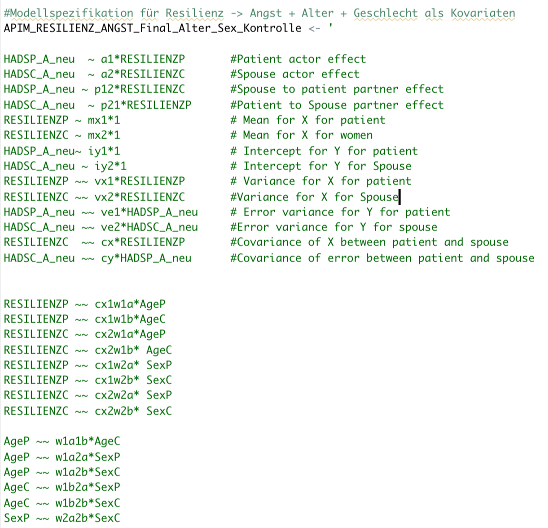 hat jemand von euch Erfahrung mit dem Actor-Partner-Interpendenz Modell (APIM)? Bei der Berechnung des APIM in R, mittels Lavaan habe ich keine Probleme und das Skript funktioniert einwandfrei, allerdings bin ich mit meinem Latein am Ende, wenn es darum geht gleichzeitig within/mixed Kovariaten einzufügen. Ich möchte gleichzeitig für Alter und Geschlecht kontrollieren, jedoch bekomme ich die ganze Zeit folgende Fehlermeldung, wenn ich das spezifizierte Modell, was ich angehängt habe, mittels dem Befehl sem schätzen möchte:
