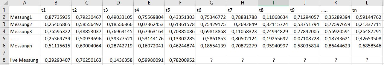Die Maschine durchläuft den Prozess der Fertigung immer wieder. In der Liste sind die Messungen 1 bis n die, die schon in der Vergangenheit gelaufen sind, also abgeschlossen. Die live Messung ist die, die sich gerade in der Produktion befindet und bis t5 vorangeschritten ist. t6 ist noch nicht erfolgt und soll nun predictet werden. Dazu sollen aber nach Möglichkeit nicht die vorangegangenen Werte aus der Reihe berücksichtigt werden, sondern aus den Messungen 1 bis n gelernten Messungen vorhergesagt werden, unter Berücksichtigung des bisherigen Verlaufes. Ob die folgenden Werte, die noch nicht eingetreten sind dann iterativ predicted werden oder auf einem anderen Wege ist offen.