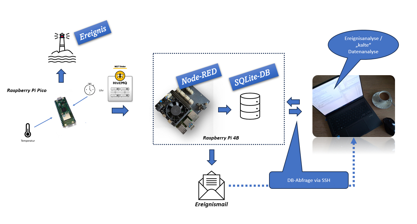 Ein wenig Clickbait, um auf mein Video aufmerksam zu machen, das ich vor ein paar Wochen auf YouTube veröffentlicht habe. Das Video beschreibt ein Projekt von der Datenerfassung über ein Raspberry Pi Pico, nutzen eine SQLite-DB auf einem Pi 4B bis hin zu einer nachgelagerten Datenanalyse auf einem Windows PC via SSH. Natürlich spielen noch ein paar Komponenten mehr mit und die Grafik zeigt dazu eine Übersicht. Möglicherweise gibt das Video tatsächlich ein paar Anregungen?
