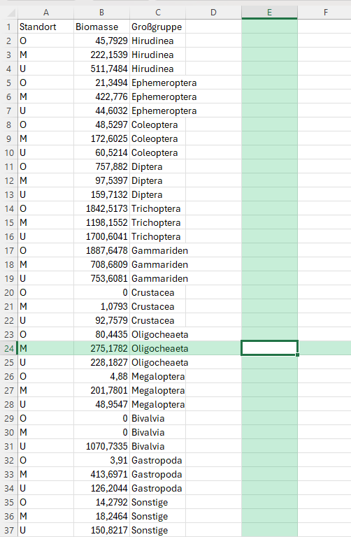 Nun habe ich ein Problem mit den Graphen in R. Ich habe mit ggplot Graphen erstellt, jedoch wird mir eine Tiergruppe (Gammariden) mit 2 Balken in dem Graphen angezeigt (Zusammensetzung Biomasse). Es sollte jedoch nur einer sein. In der Excel- Datei existiert diese Tiergruppe auch nur einmal pro Standort. Ich habe schon überprüft ob eine andere Tiergrupe die selbe Farbe hat, was nicht der Fall ist. Hier einmal das genutzte Skript: