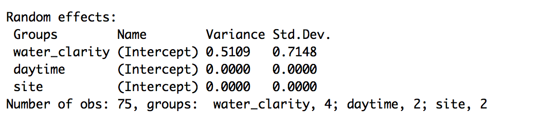 rois_model = glmer(PosidoniaRatio ~ colour + length + (1|site) + (1|water_clarity) + (1|daytime), data=tempdat, family=binomial)