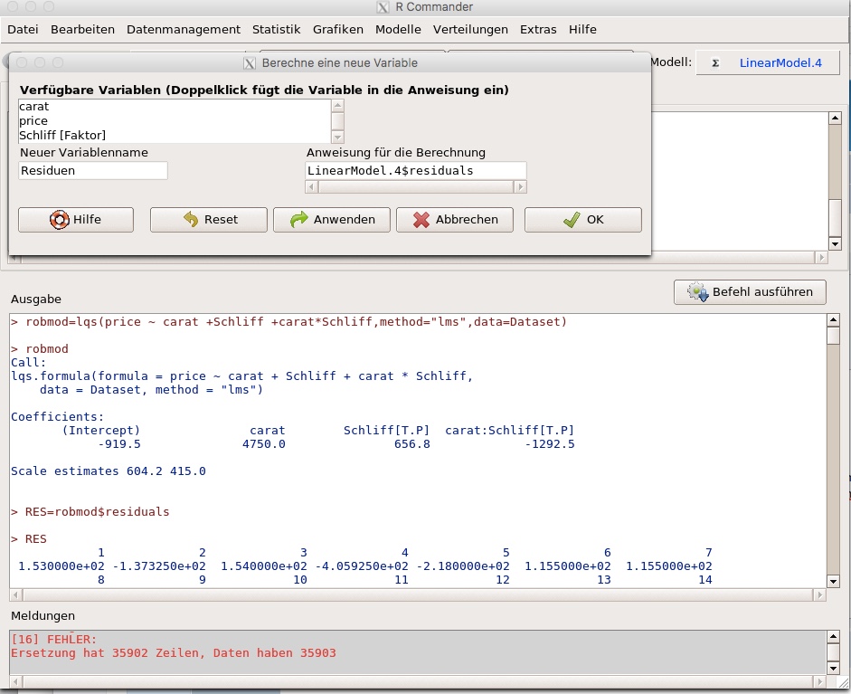Ich komme in R soweit, dass ich die Ausreißer bestimmen kann und dann einen neuen Datensatz erstelle, mit bereinigten Werten. Nun möchte ich die Residuen auf Normalverteilung prüfen. Dazu versuche ich seit Stunden in die Datenmatrix eine neue Spalte einzufügen, um die Residuen in die Matrix zu bekommen. Allerdings erhalte ich immer einen Fehler.
