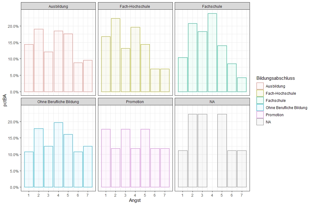 Allerdings ist das Ergebnis noch nicht so ganz so, wie ich es gerne hätte. Gibt es die Möglichkeit die Werte in Relation zueinander zu setzen? Die Angaben in den einzelnen Tabellen zeigen das Verhältnis zu der Gesamtanzahl der Antworten. Mein Ziel ist es, die jeweiligen Antworten in Relation zu den jeweiligen Bildungsabschlüssen zu stellen, sodass die einzelnen Tabellen miteinander vergleichbar werden. Also dementsprechend, dass beispielsweise 10% der Personen ohne Bildungsabschluss eine Ausprägung der Angst von 2 haben und 10% all derer, die eine Ausbildung haben. Somit wären die Balken gleich groß, obwohl in absoluten Zahlen bei keinem Bildungsabschluss nur beispielsweise fünf Personen so geantwortet habe, bei denen mit Ausbildung allerdings 40.