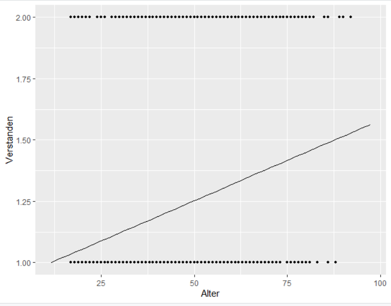 wenn das so ist, darf ich vielleicht sagen, dass die y-Achsenbeschriftung wahrscheinlich nicht Dein führendes Problem ist. Auf das führende Problem hat Athomas hingewiesen: um aus einem metrischen Alter auf das binäre Verstehen zu schließen dürfte aller Wahrscheinlichkeit nach eine logistische Regression angemessen sein.