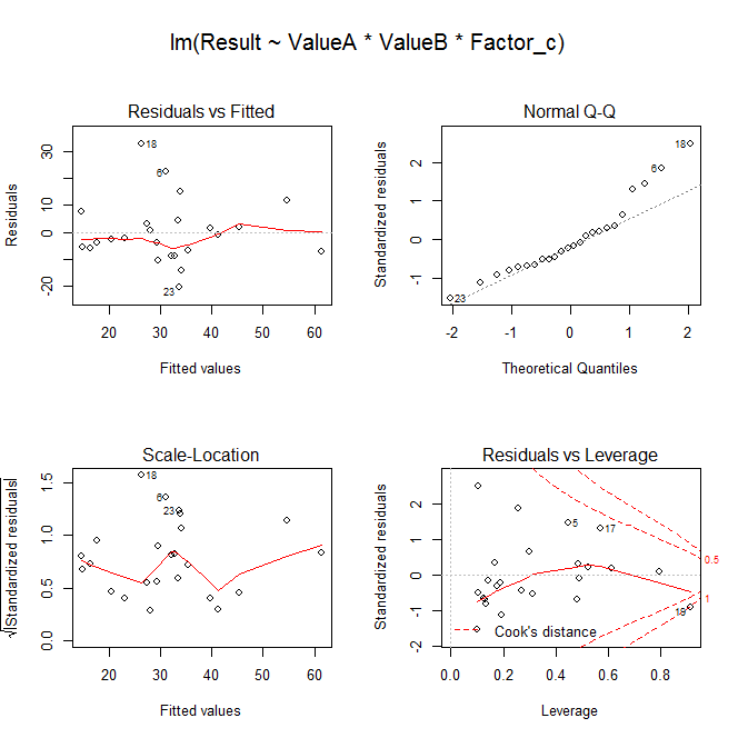 Wenn ich das Model lm(Result~ValueA * ValueB * Factor_c) bilde, erhalte ich folgende Ausgaben(siehe unten)