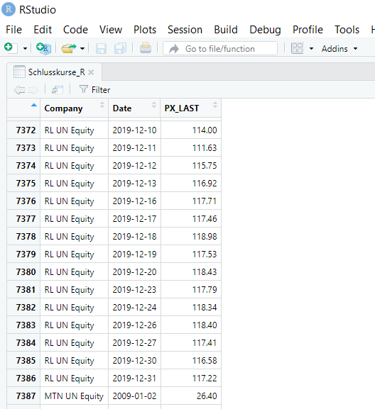 Daher möchte ich nicht nur einen Mittelwert von PX_LAST über alle Beobachtungen der gesamten Variable Company.