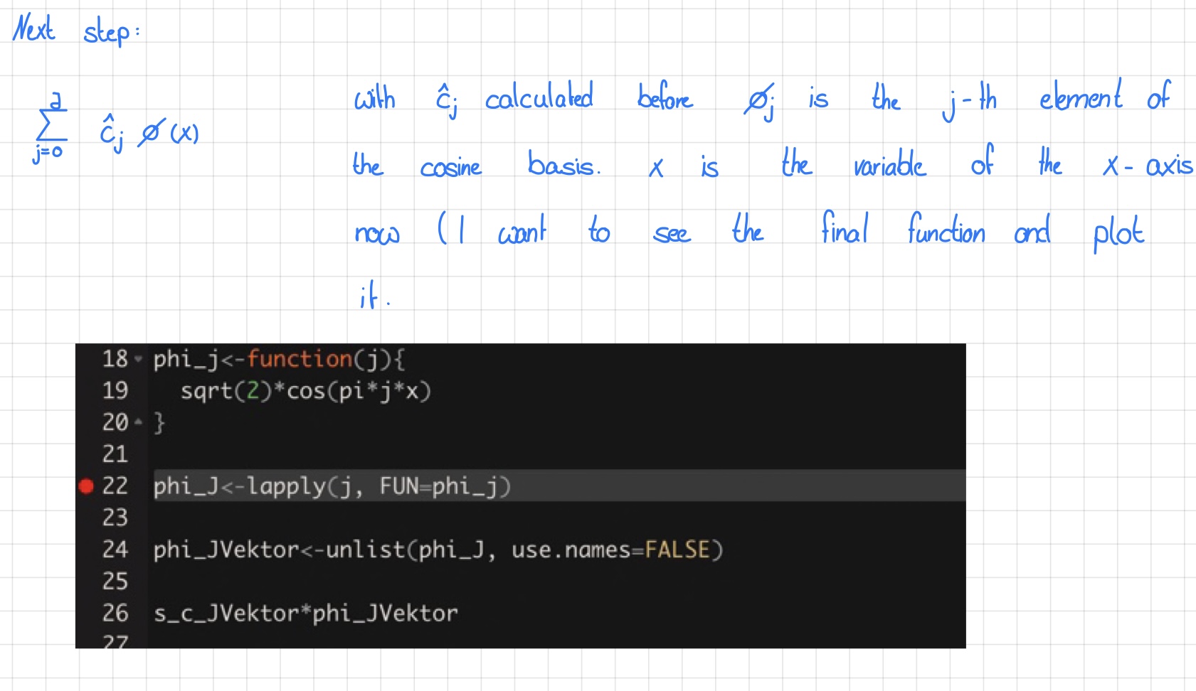 Jedoch muss eigentlich erst die ganze Summe s_c_j*phi_j ausgeschrieben werden und dann kann man das für jedes einzelne x=seq(...) auswerten.