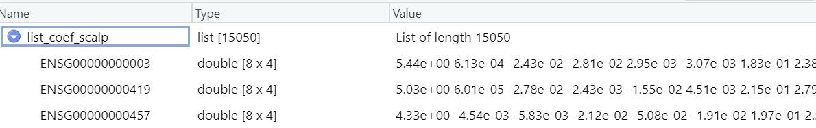 $ ENSG00000000419: num [1:8, 1:4] 5.03 6.01e-05 -2.78e-02 -2.43e-03 -1.55e-02 ...