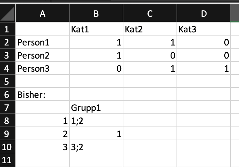 Hier habe ich zwei Gruppen, mit jeweils 3 Personen. Nun will ich die Mehrfachnennungen jeweils in einer eigenen Kategorie haben.