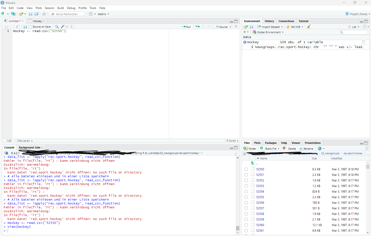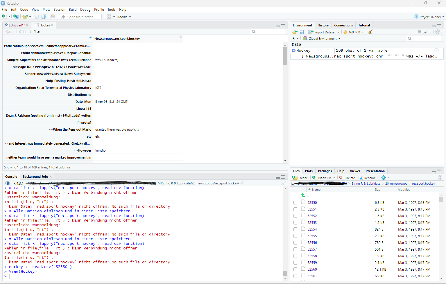Deine Screenshots enthalten viel zu wenig Information, um sie für sich zu verstehen. Du rufst da eine Funktion read_csv_function auf. Die ist in Standard R nicht enthalten und wahrscheinlich aus irgendeinem importierten Paket. Aus welchem?Each newsgroup is stored in a subdirectory, with each article stored as a separate file.
