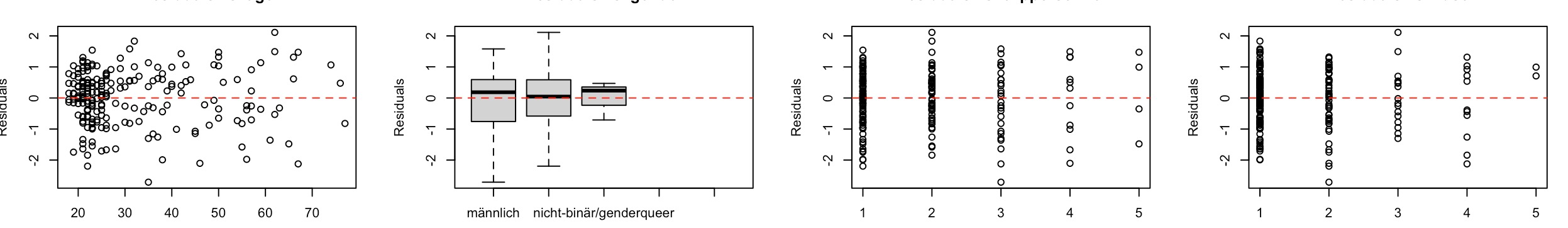 Wenn ich das richtig verstanden habe, sollten bei den Boxplots die means um 0 herum sein und bei den Punktwolken ähnliche Verteilungen vorliegen. Da nirgendwo ein kurvillinearer Zusammenhang erkennbar ist, sollte meine Vorraussetzung nicht verletzt sein, oder? Das da eventuell kein wirklicher Zusammenhang ist bei Kovariaten ja dann eigentlich egal oder? Oder habe ich die plots falsch gemacht?