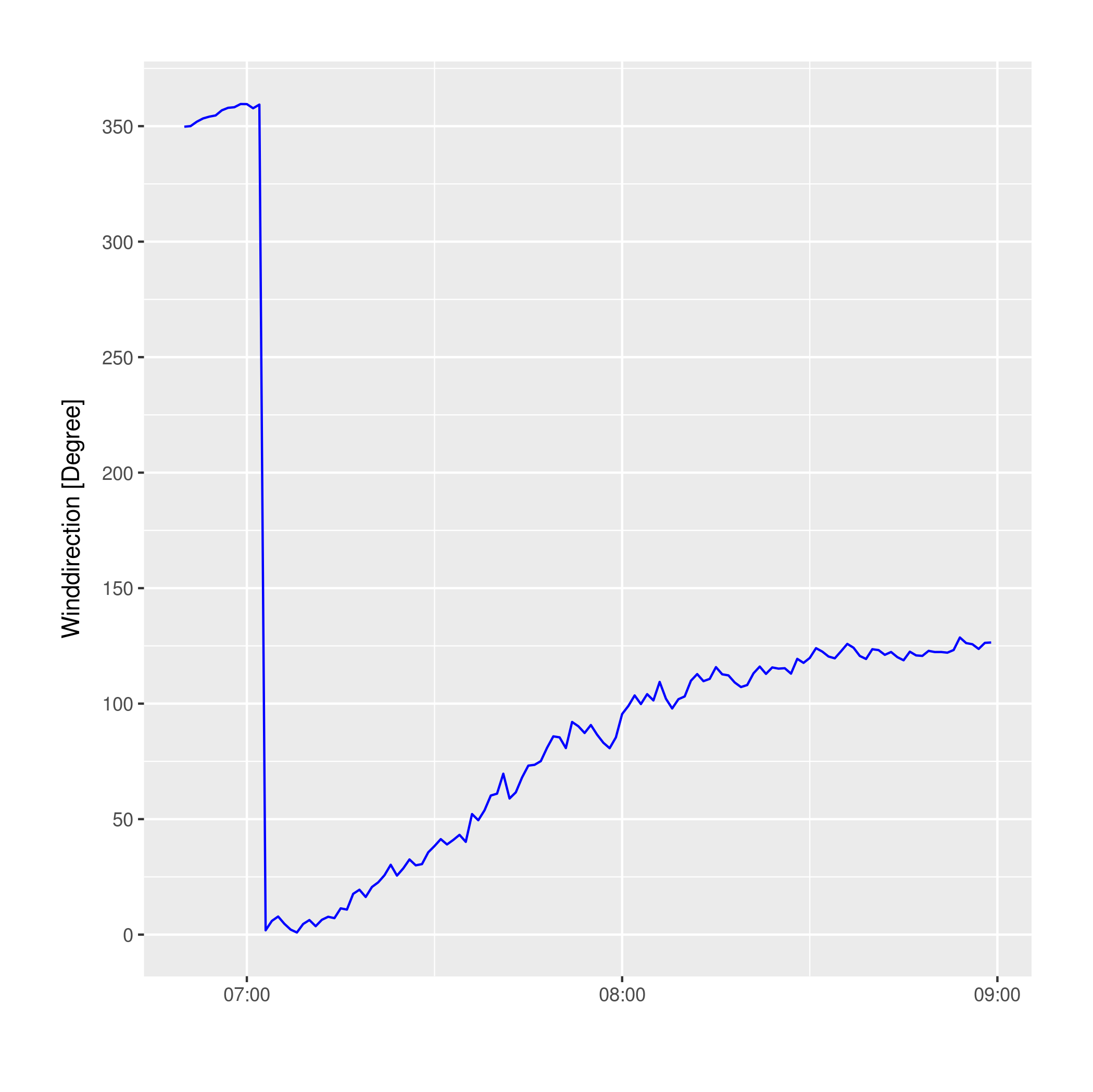 Allerdings sieht man um ca. 7 Uhr, dass der Wind von Nord auf Ost/Südost dreht. Dabei entsteht ein großer Sprung im Linienplot, was auch kein Fehler ist, dieser allerdings nicht schön ist und auch etwas verwirrend, da die Richtung immer noch die gleiche ist.