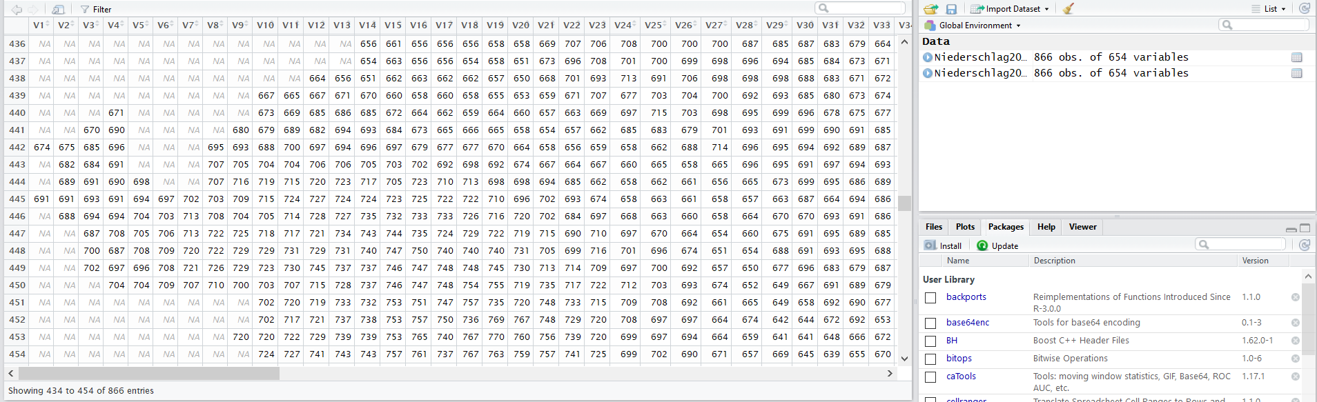 Ich habe einen Datensatz (ftp://ftp-cdc.dwd.de/pub/CDC/grids_germ ... 617.asc.gz), welcher ein Raster (654x866 Punkte) über die jährlichen Niederschlagswerte in DEU enthält, mit dem Befehl read.table eingelesen. Das Ergebnis kann in der angehängten Datei gesehen werden. Jedenfalls besteht der Datensatz nun aus 654 Variablen und 866 Beobachtungen, die aber eigentlich nur die Koordinaten im Raster darstellen.