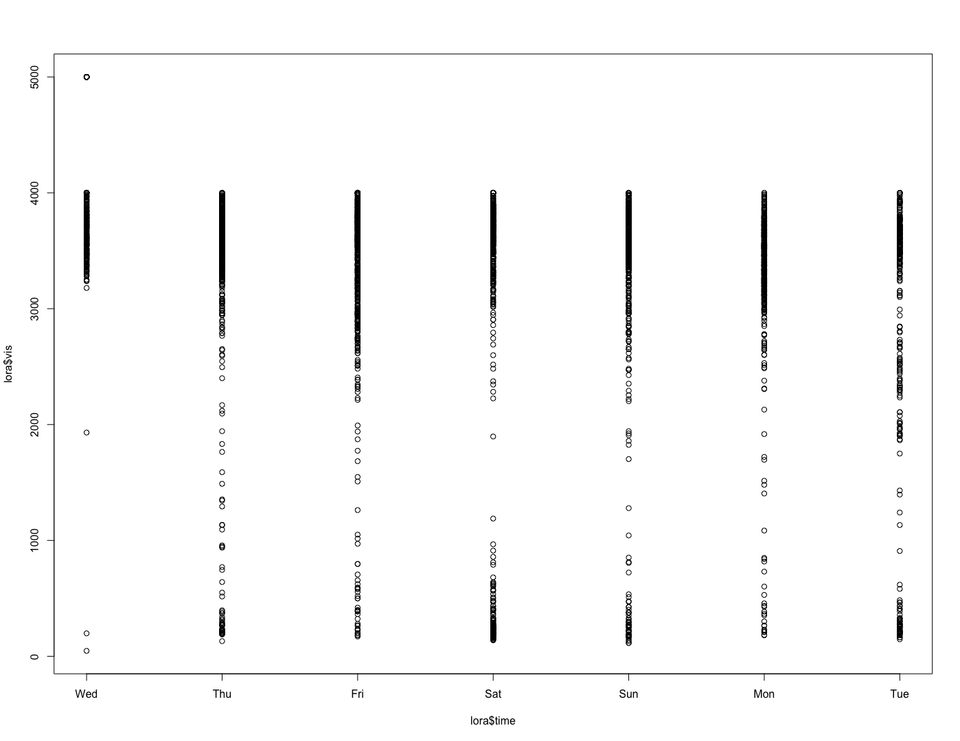 Ich möchte auf der y-Achse die Daten lora$vis haben und auf der x-Achse alle Werte die es in der Datei gibt (3 minütige Werte).
