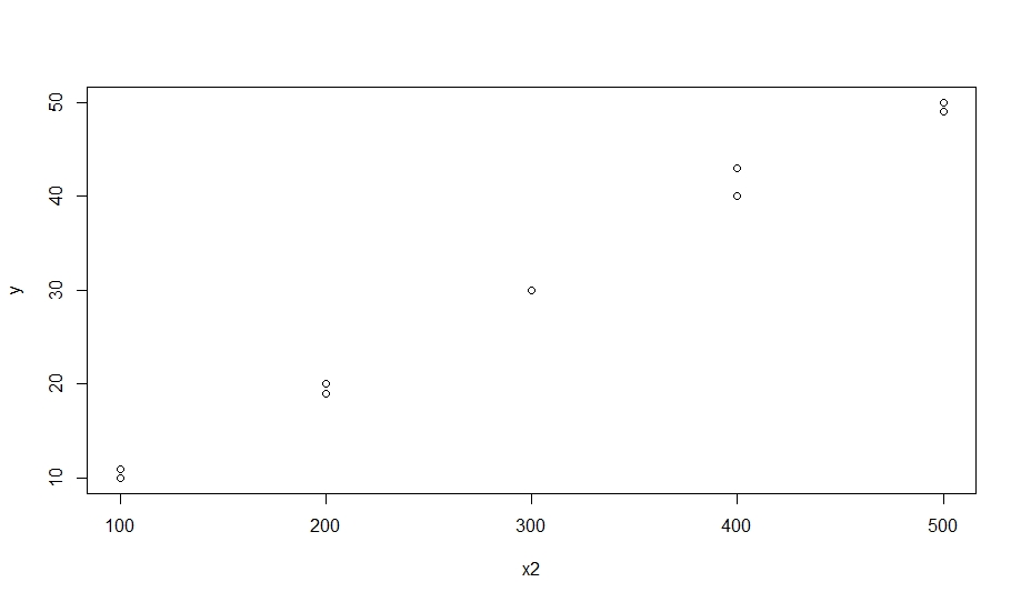 plot(x2,y,type="n",ylab = "y", xlab = "x2",ylim = c(0,50),xlim = c(0,500))