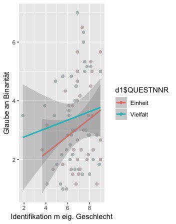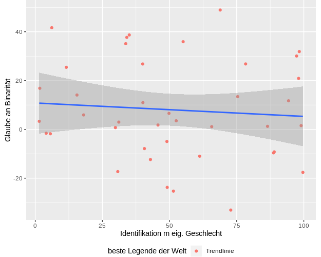 labs(x = "Identifikation m eig. Geschlecht", y = "Glaube an Binarität") +