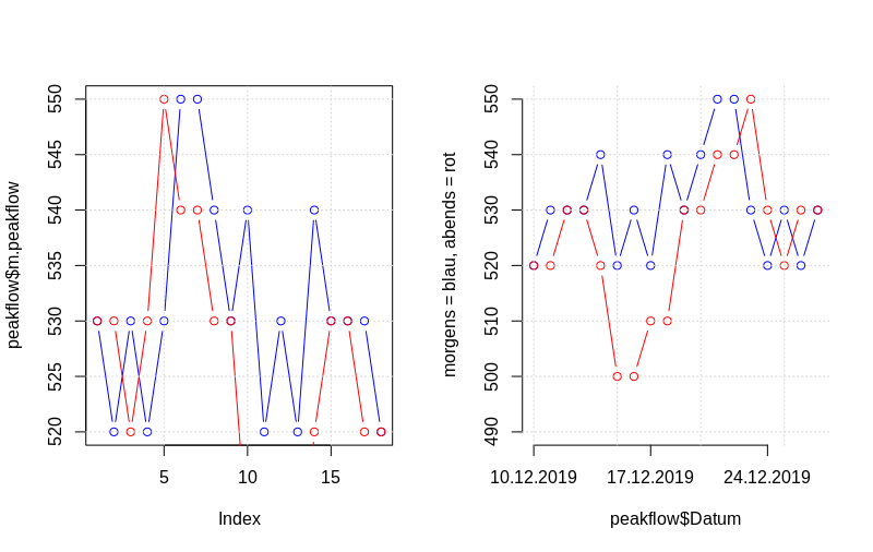 Die Anzahl der zu setzenden ticks auf der x-Achse habe ich mit nrow(peakflow) - c(0:2) * 7 noch manuell gesetzt. Da müsste man sich später was einfallen lassen, um bei einem veränderten Zeitraum die richtige Anzahl zu spezifizieren.