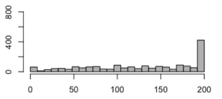 Das Problem zeigt sich darin, dass die Extrempunkte, insbesondere die 200, sehr häufig vorkommen. Die Verteilung schaut also eher wie eine gespiegelte Poisson Verteilung aus, weshalb die Ergebnisse mit einer normalen linearen Regression nicht signifikant werden.