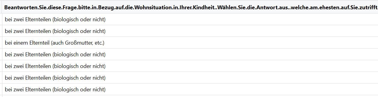 Bei meinem eingelesenen R-Datensatz sind die ersten beiden Werte "bei zwei Elternteilen (biologisch oder nicht)" und die dritte Beobachtung "bei einem Elternteil (Großmutter etc.)". Das sieht dann so aus:
