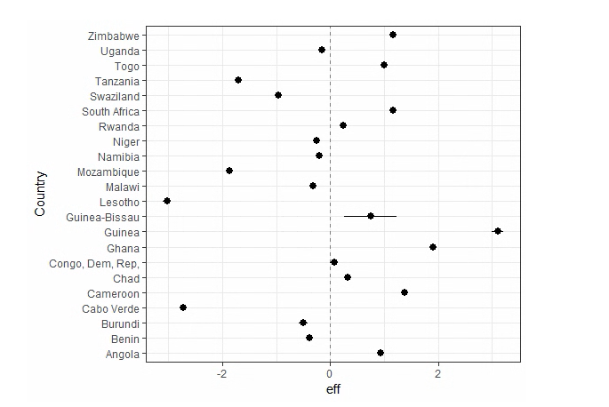Auf der y-Achse sind die Länder dargestellt. Auf der x-Achse befindet sich mittig eine 0. Links und rechts davon steht -2 bzw. +2. Als Beschriftung dieser Achse gibt R lediglich "eff" an.