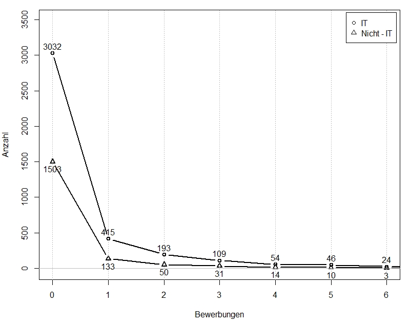 xlim = c(0, 25), ylim = c(0, 3500), xlab="Bewerbungen in der IT")