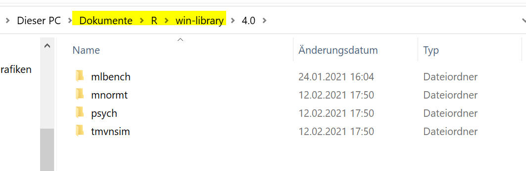Da Du für eine Behörde arbeitest, gehe ich davon aus, dass Du mit Windows arbeitest. Nach der Genehmigung durch Deine IT (was nicht nur für Behörden sondern auch für Unternehmen ab einer gewissen Größe gilt) ist das mit den Paketen kein Problem mehr. Pakete kannst Du jederzeit ohne Admin-Rechte nachinstallieren, denn unter dem Windows-Zugriffsrechten wird dafür ein Verzeichnis im Dokumentenordner angelegt (siehe Bild).