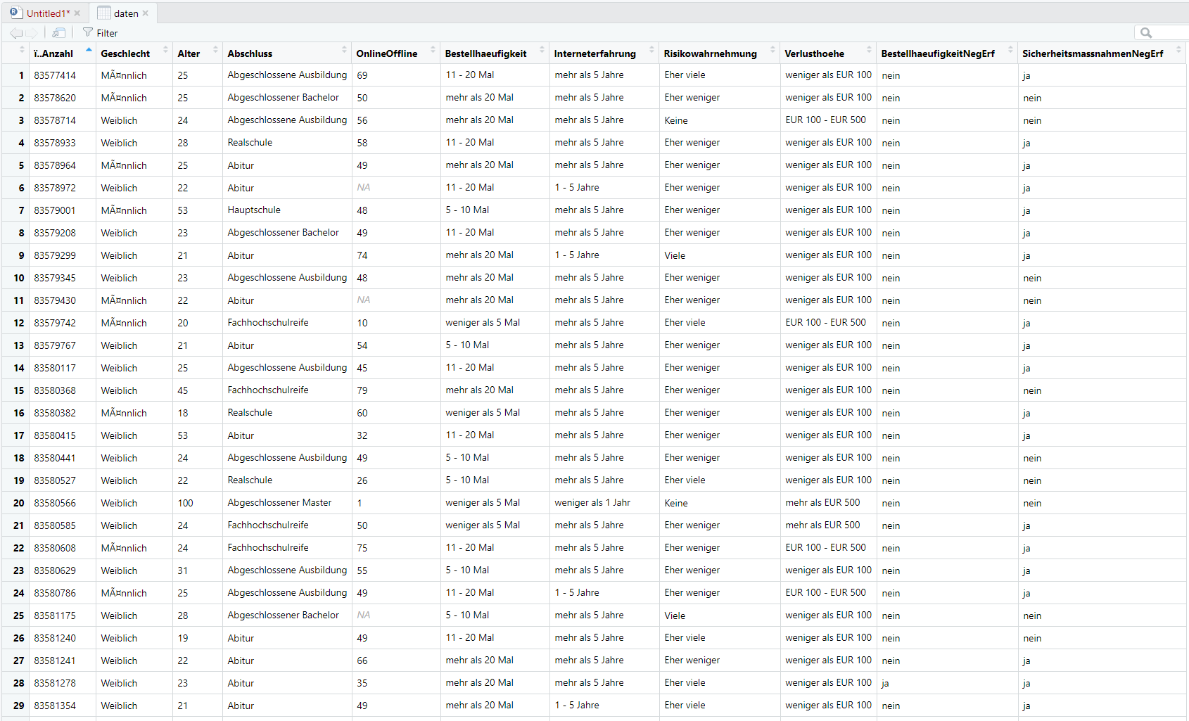 Die Werte, die als "factor" definiert waren, also die Risikowahrnehmung (Viele, eher viele, eher weniger, Keine), den Abschluss (Hauptschule, Realschule, Fachhochschulreife, Abitur, Ausbildung, Bachelor, Master), die Bestellhäufigkeit (weniger als 5 Mal, 5 - 10 Mal, 11 - 20 Mal, mehr als 20 Mal), die Interneterfahrung (weniger als 1 Jahr, 1 - 5 Jahre, mehr als 5 Jahre) und die Verlusthöhe (weniger als EUR 100, EUR 100 - EUR 500, mehr als EUR 500) habe ich mit folgender Eingabe bearbeitet, um sie als "numerisch" zu definieren:
