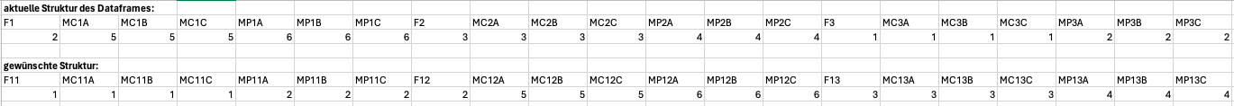 Ich habe mal die aktuelle Struktur meines Dataframes und die Struktur, wie ich sie mir neu geordnet vorstelle, versucht in Excel darzustellen. Ich habe das Bild angehängt.