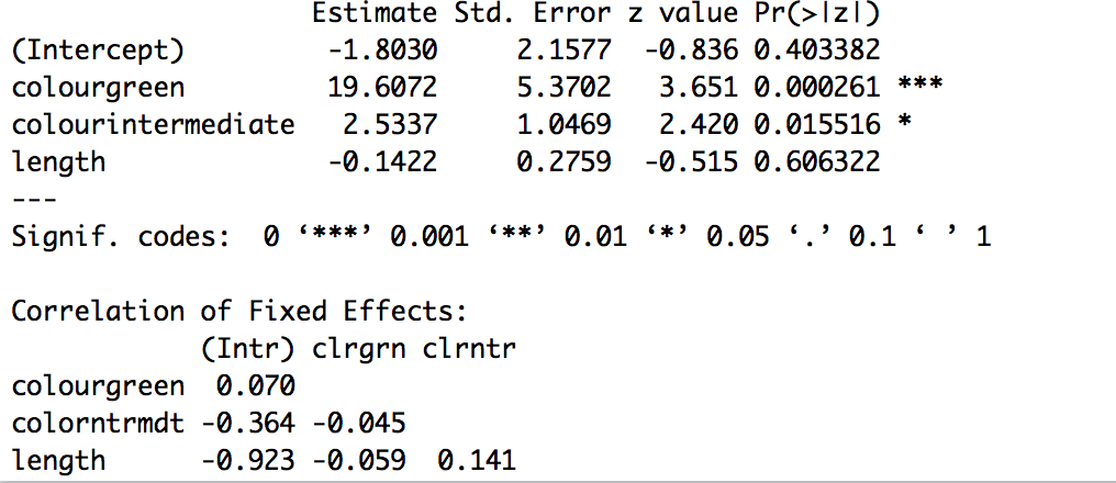 rois_model = glmer(PosidoniaRatio ~ colour + length + (1|site) + (1|water_clarity) + (1|daytime), data=tempdat, family=binomial)