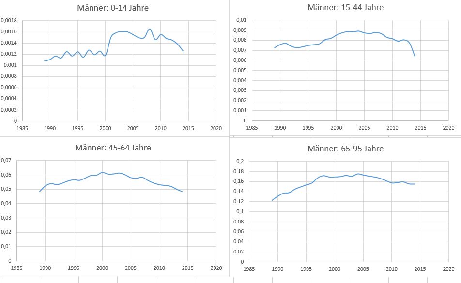 Ich schreibe gerade an einer Arbeit und habe für diese den Auftrag bekommen, die Erkrankungsraten von Herzkreislauferkrankungen bei Männern in 4 Altersgruppen (0-14 Jahre, 15-44 Jahre, 45-64 Jahre und 65-95+ Jahre) grafisch über die Zeit darzustellen und im Anschluss für jede Altersgruppe das "beste" Regressionsmodell (best-fit) zu finden.
