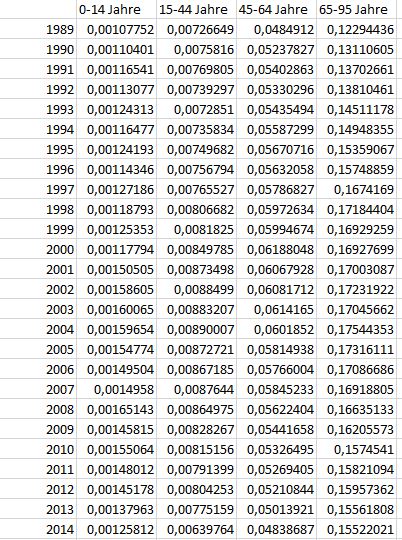 Wenn ja, müsste ein Zukunftsmodell für jede außer der jüngsten Gruppe das Wissen aus den anderen Gruppen mit einbeziehen. Gibt es noch irgendwelche Randinformationen über die jeweiligen Jahrgänge, die man einbeziehen kann? Beispielsweise den durchschinttlichen Nikotinkonsum dieser Jahrgänge?