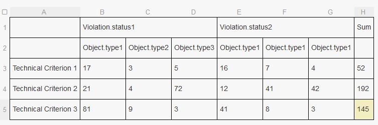 Folgende Frage gibt es zu beantworten: Es gibt 25 Level von "Architektur Criterion". Zu jeder will ich wissen, wie viele Einträge es gibt mit den beiden Violation.Status Möglichkeiten (Added und Deleted), wenn man das Ganze noch nach "Critical.Y.N" unterscheidet. Hier ist neben der 0 auch der Wert 1 zulässig. Das Ganze sollte so in etwa aussehen.